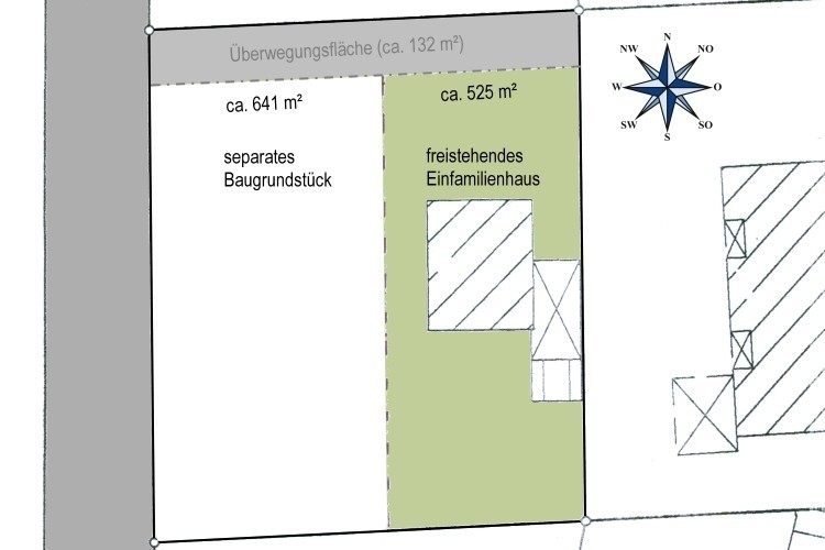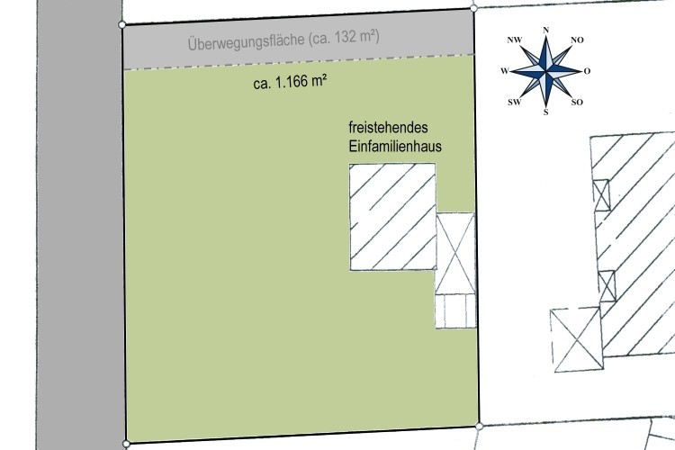 - insgesamt stehen ca. 1.166 m² nutzbares Grundstück + ca. 132 m² Überwegungsfläche zur Verfügung