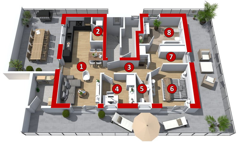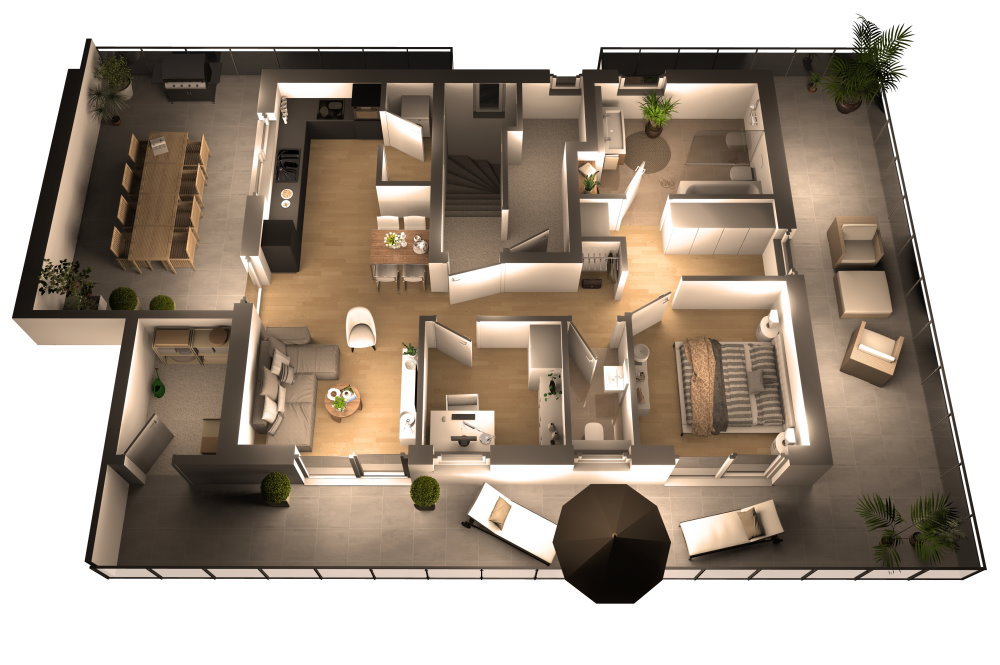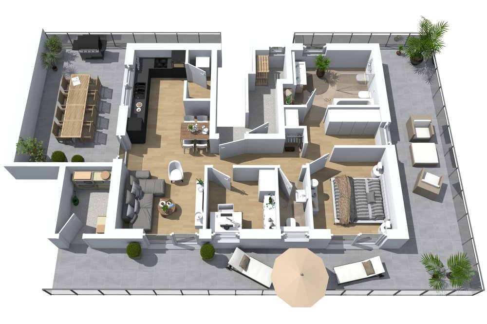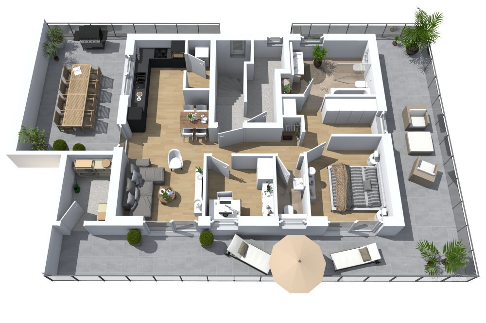 - umlaufende, gut nutzbare Dachterrasse + zentrale Terrassenfläche direkt an der Küche mit ca. 8,47m * 3,82m = 32,35m² Fläche!