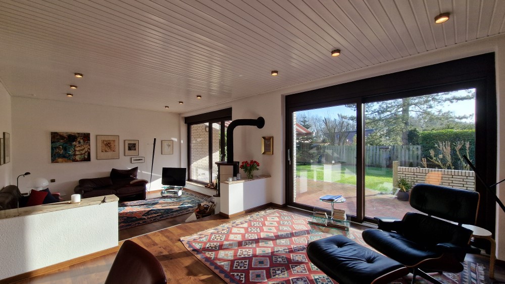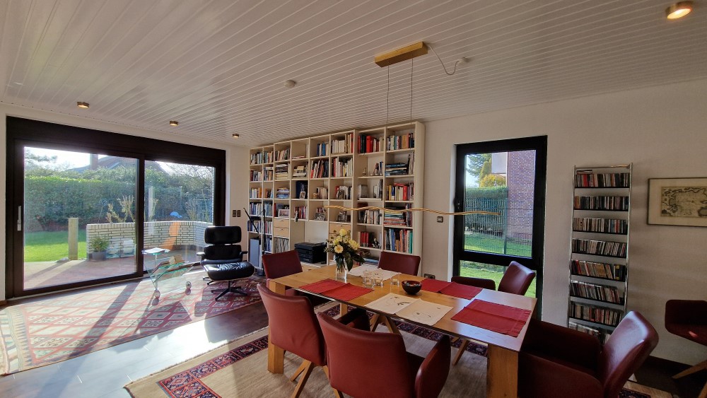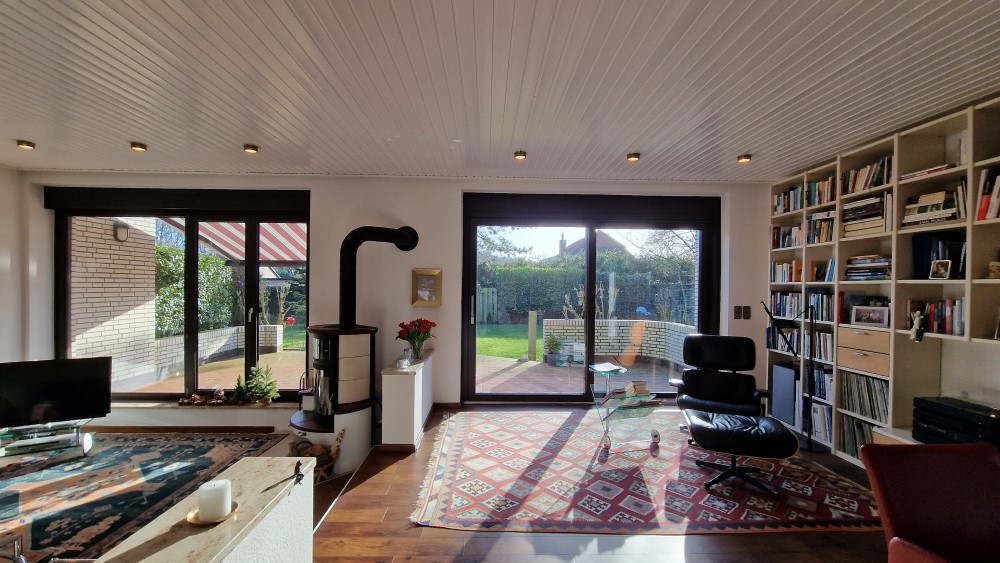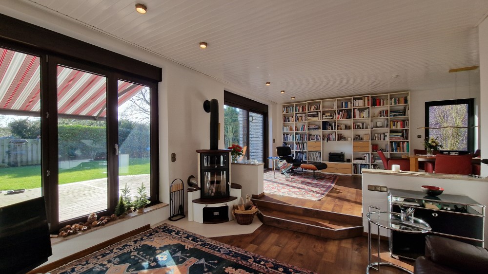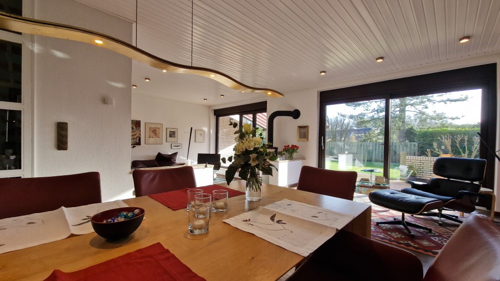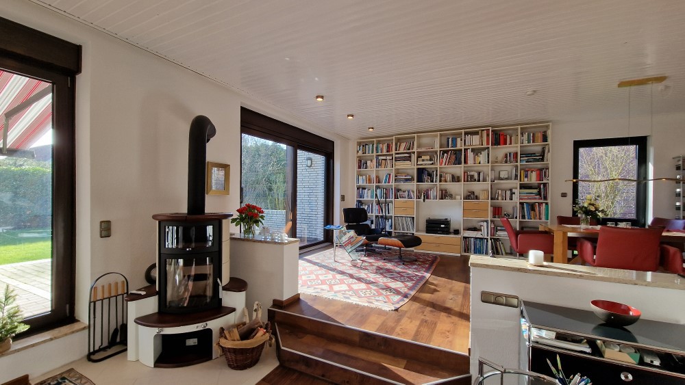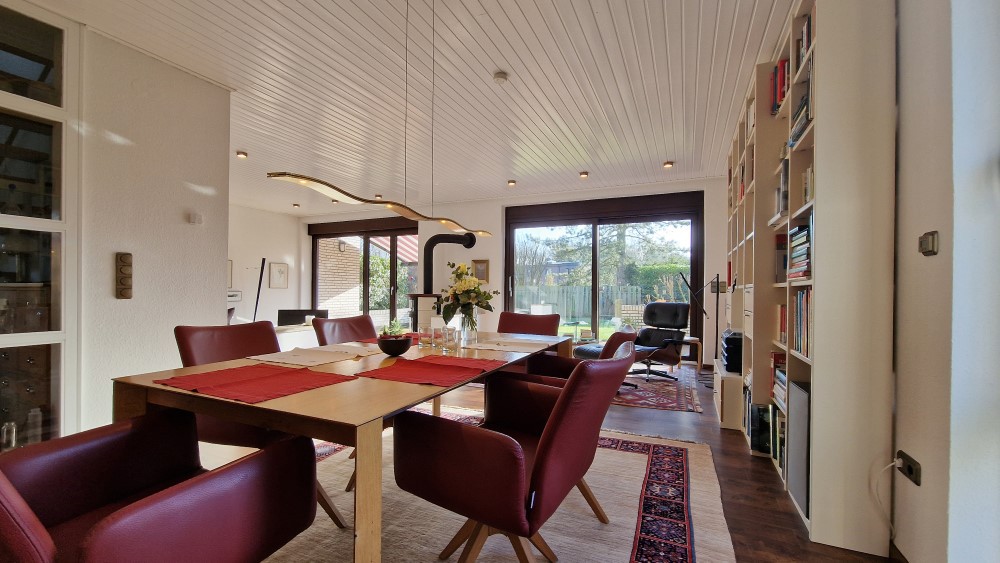 - sehr apartes Wohn- / Esszimmer mit ca. 47 m² Wohnfläche, leicht abgesenktem Wohnbereich, herrlicher Aussicht in den Garten und auf den Kaminofen