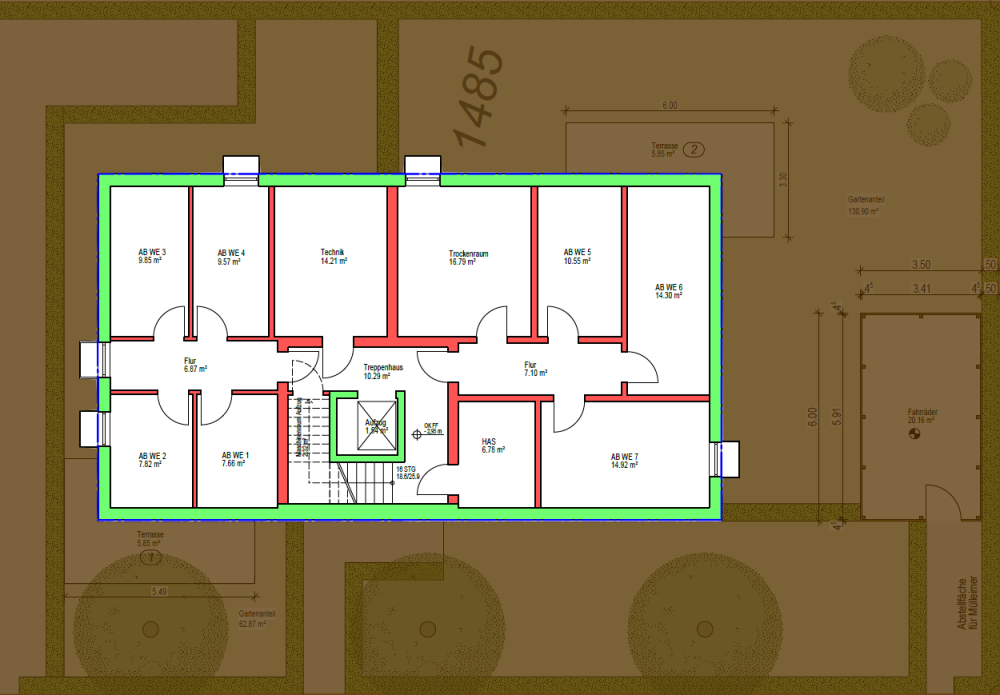 | Abstellraum Keller: | 7,66 m² | 7,82 m² | 9,85 m² | 9,57 m² |