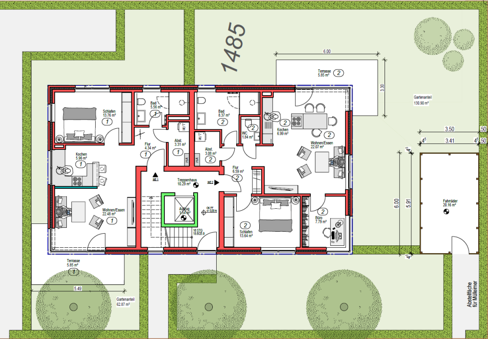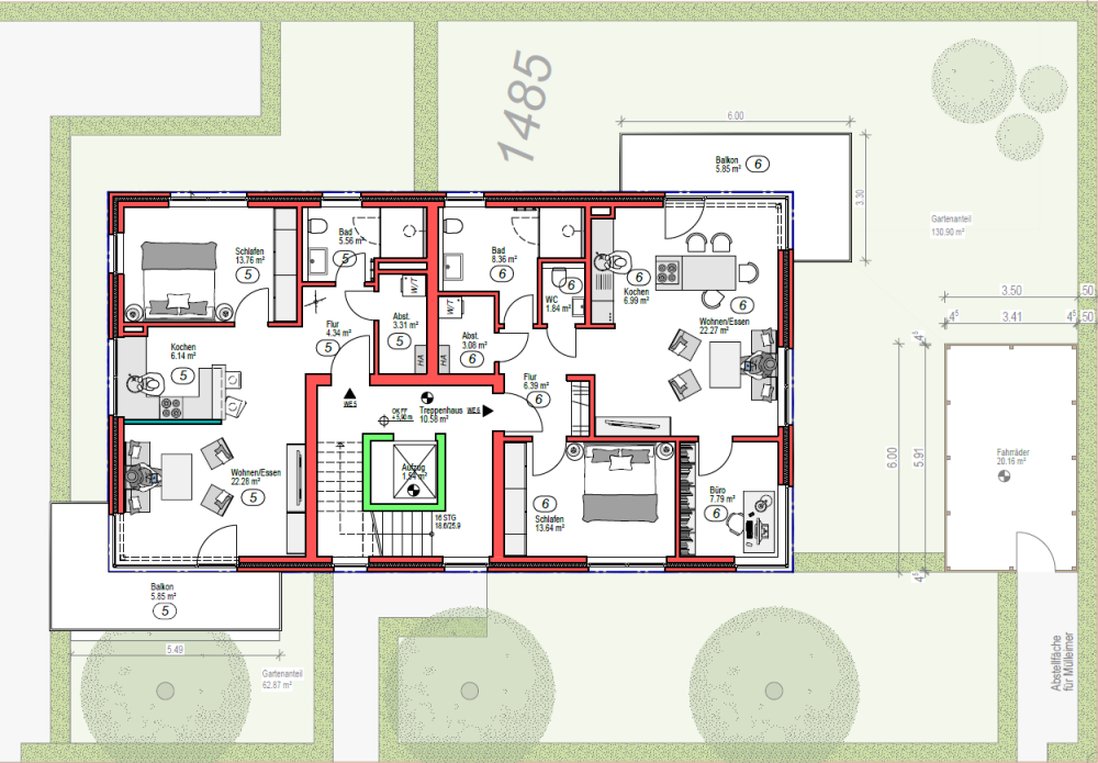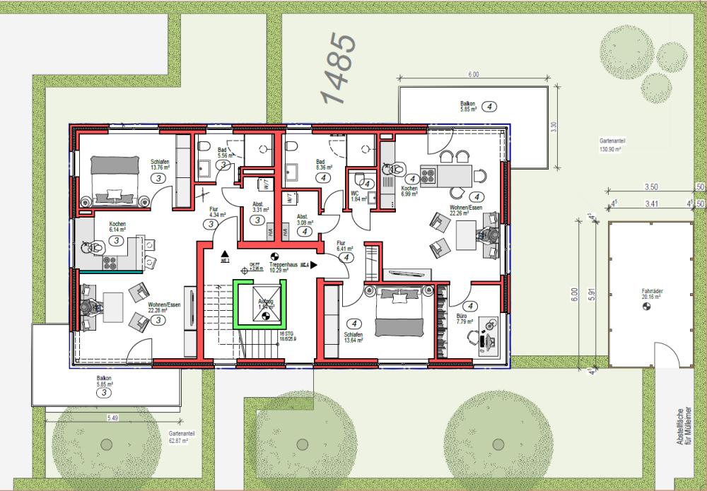 | Schlafen: | 13,76 m² | 13,64 m² | Gast: | 17,39 m² |