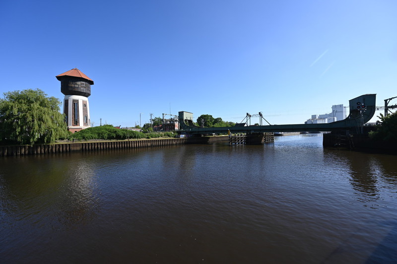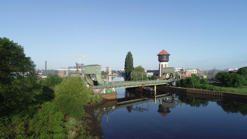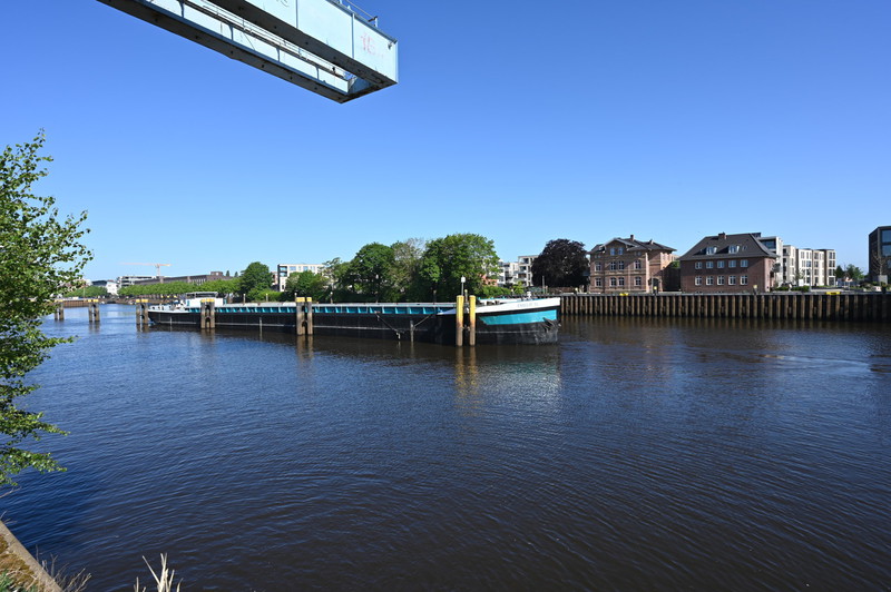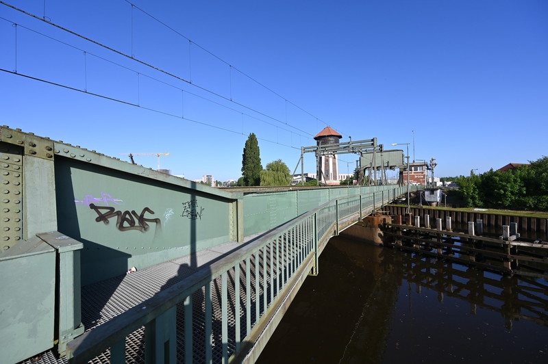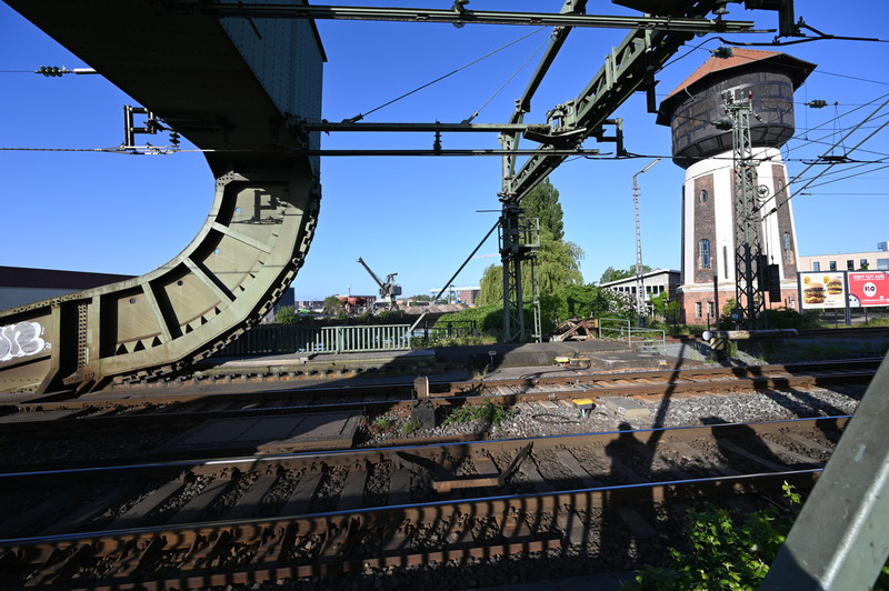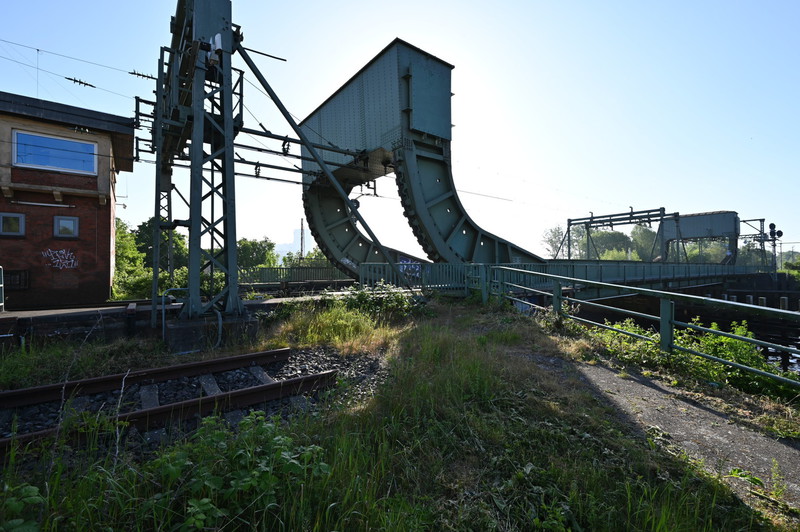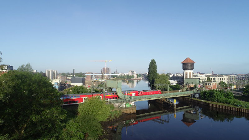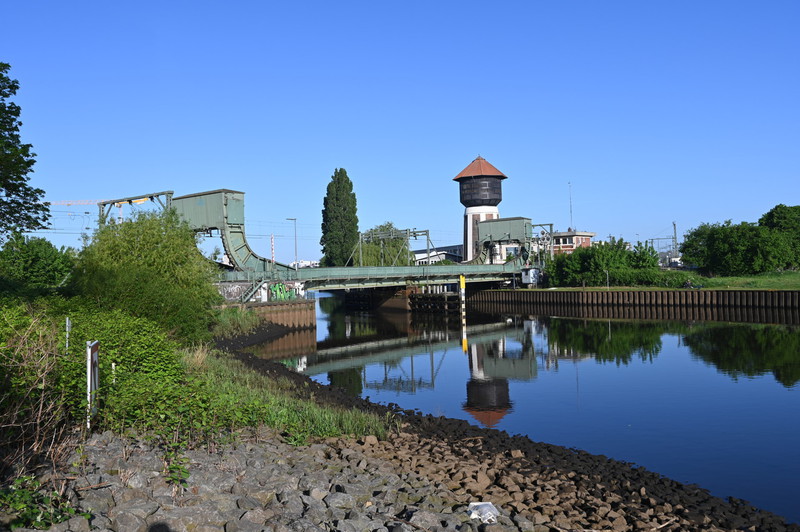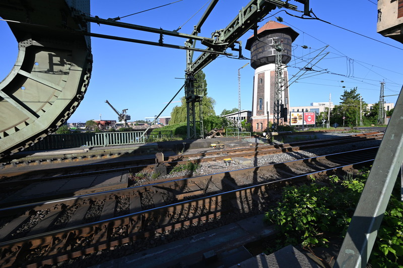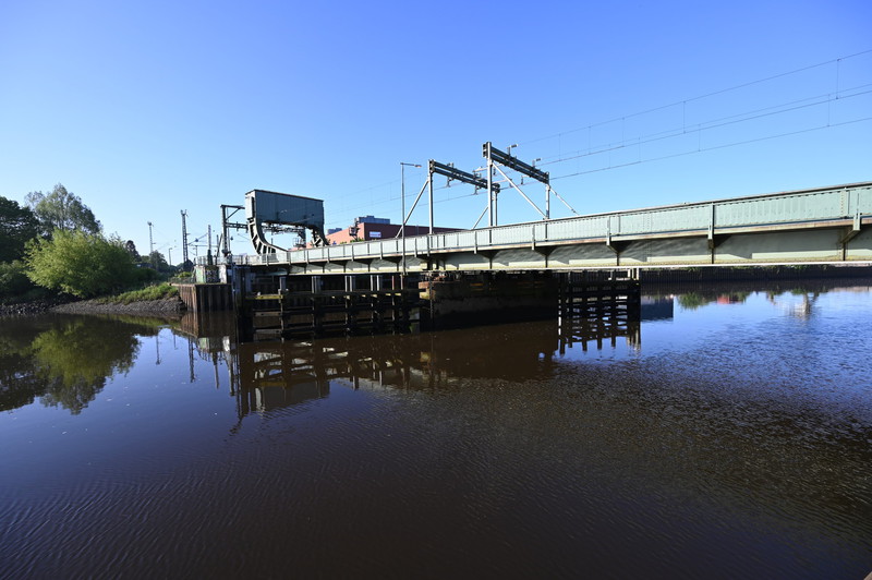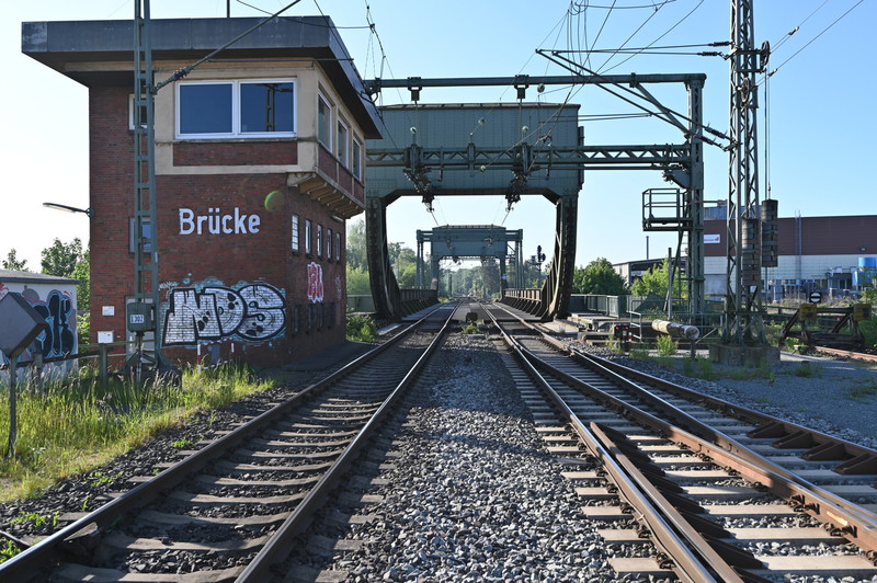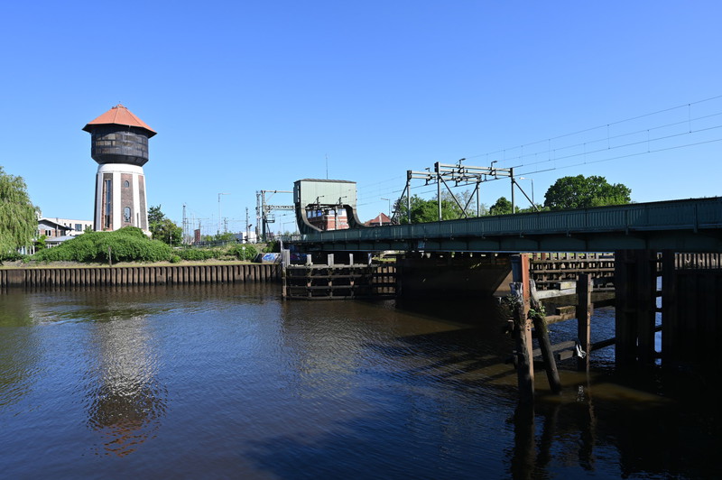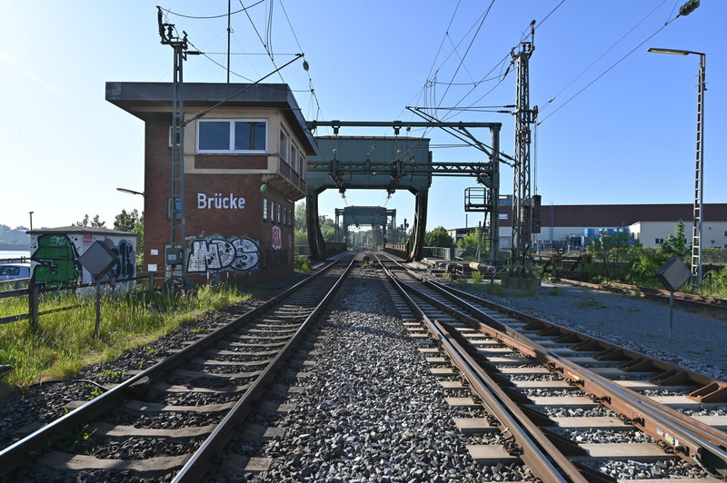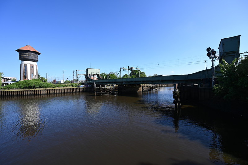 ˄ 15. Mai 2022: Blick über die Eisenbahnbrücke auf den Alten Stadthafen
