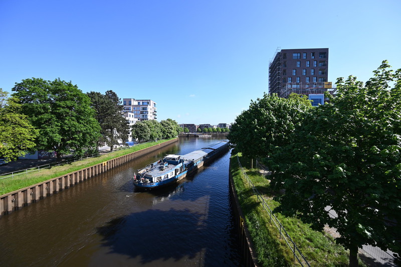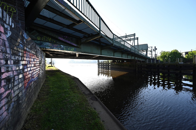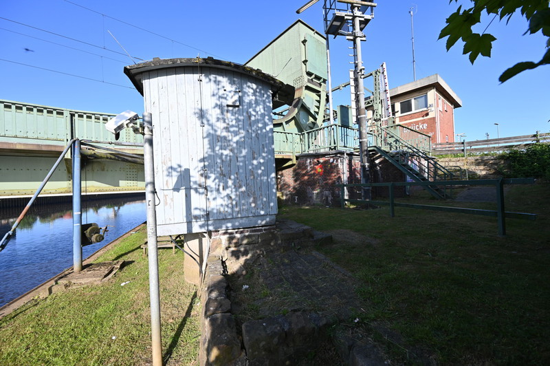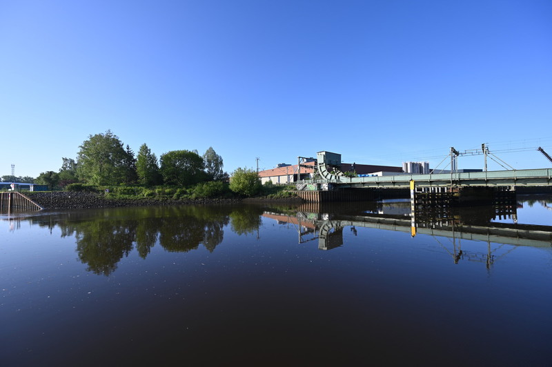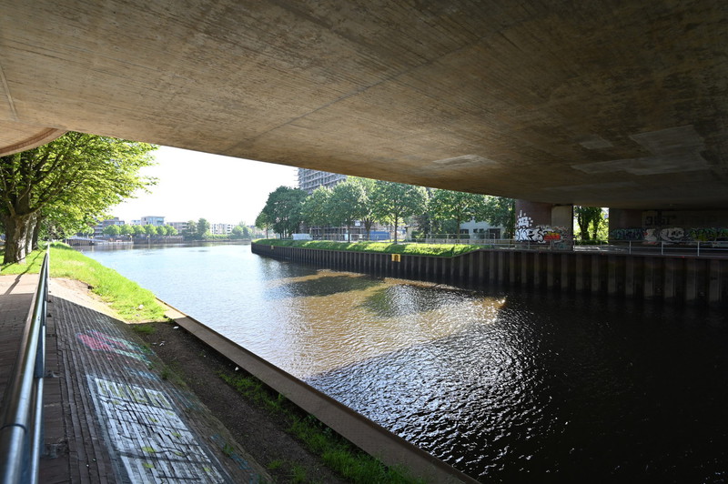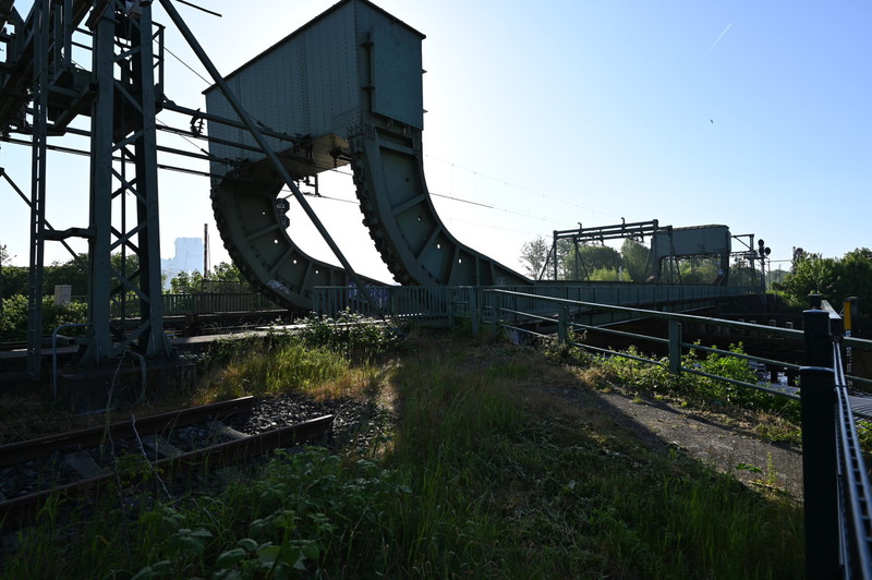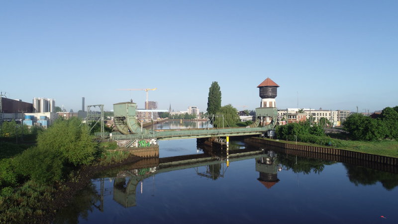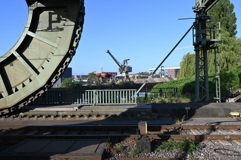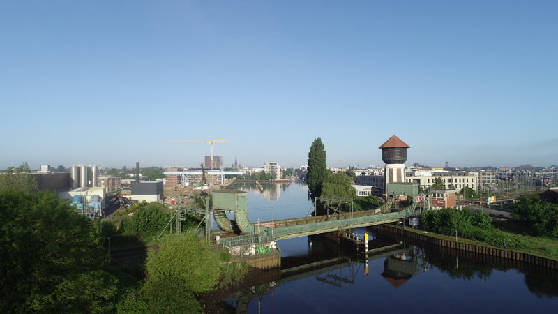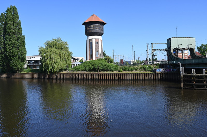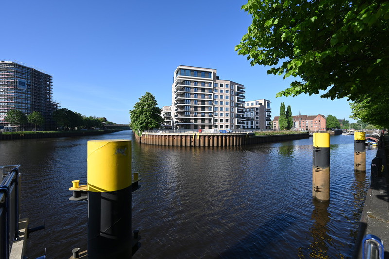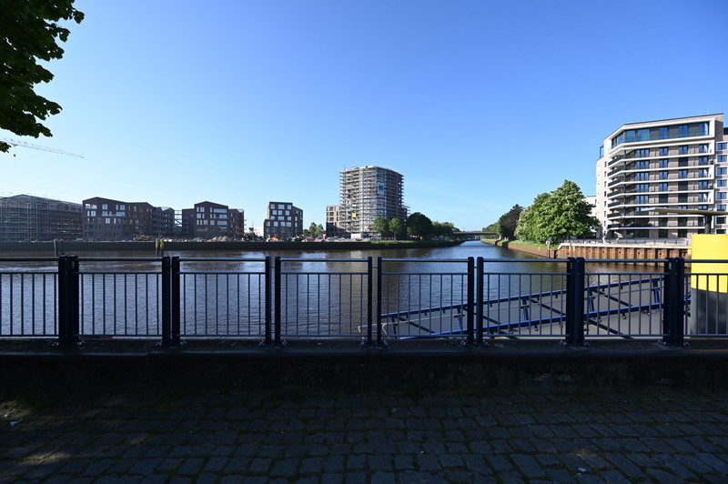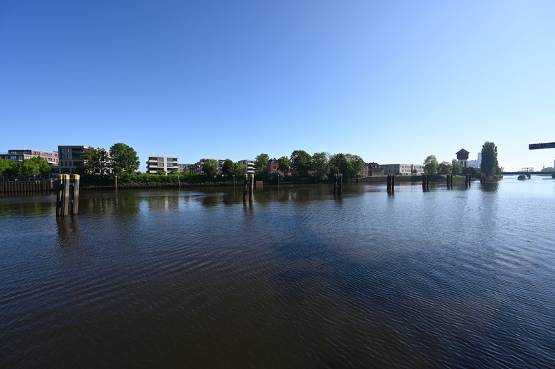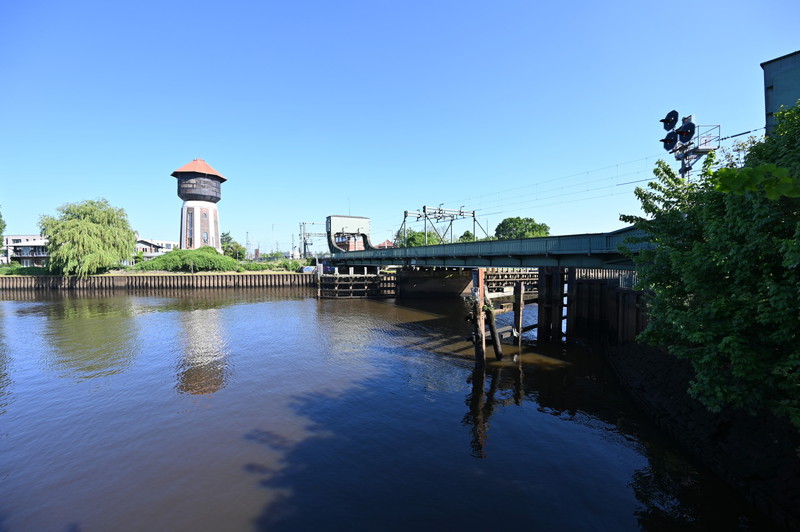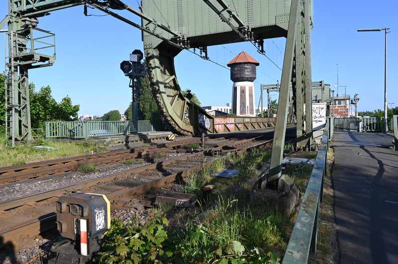˄ 15. Mai 2022: Blick über die Eisenbahnbrücke auf den Alten Stadthafen