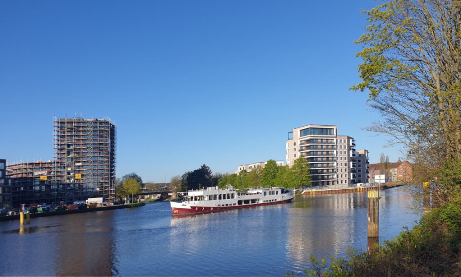 ˅ 22. April 2022 | Hier verlässt gerade das Flussschiff "LIBERTÉ" die Huntestadt