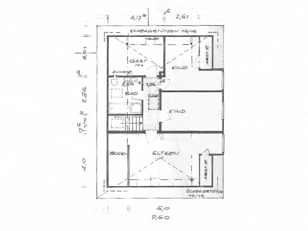 - Raumaufteilung oben: Bad (mit Fenster), Flur, 4 Zimmer