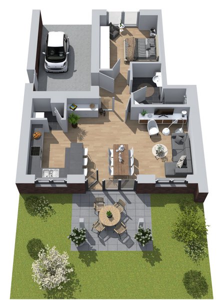 Der Grundriss & 3D-Grafiken einer bauähnlichen Gartenwohnung: