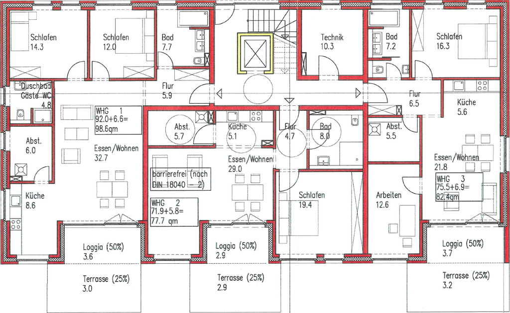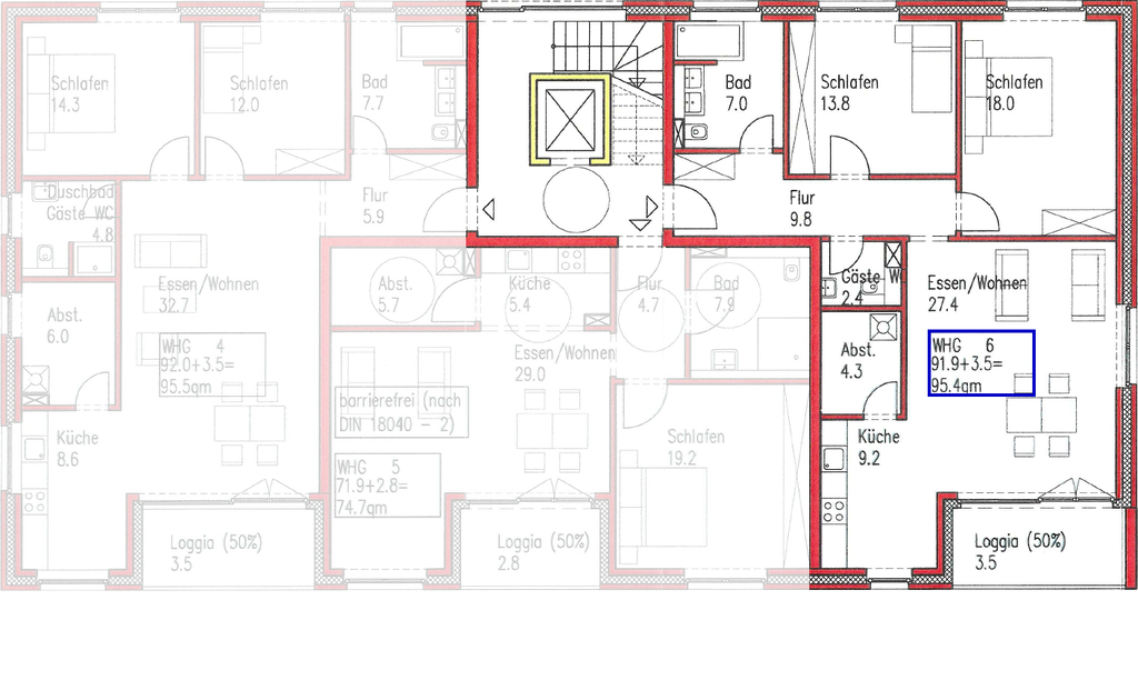 - Wohnung mit 95,40 m² Wohnfläche, 3 Zimmer, Kochbereich, HWR, Bad, Gäste-WC & Loggia (überdachter Balkon);